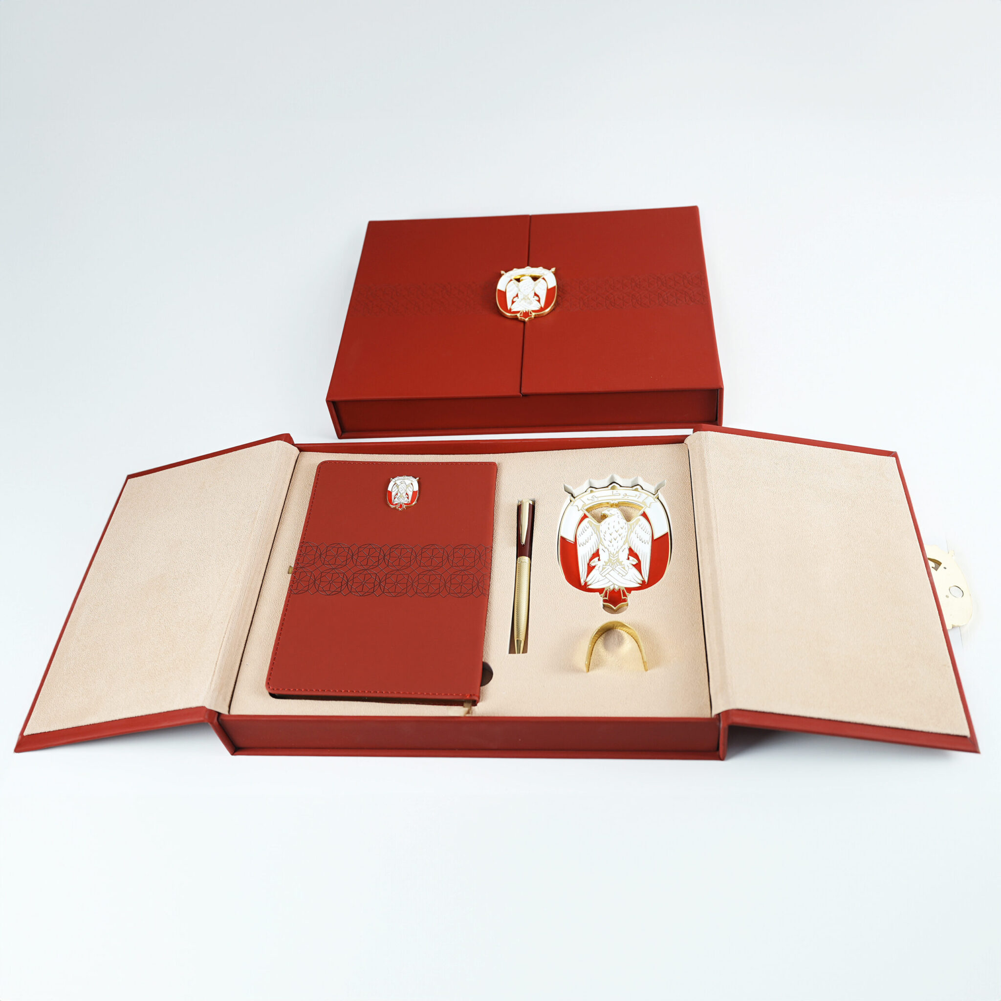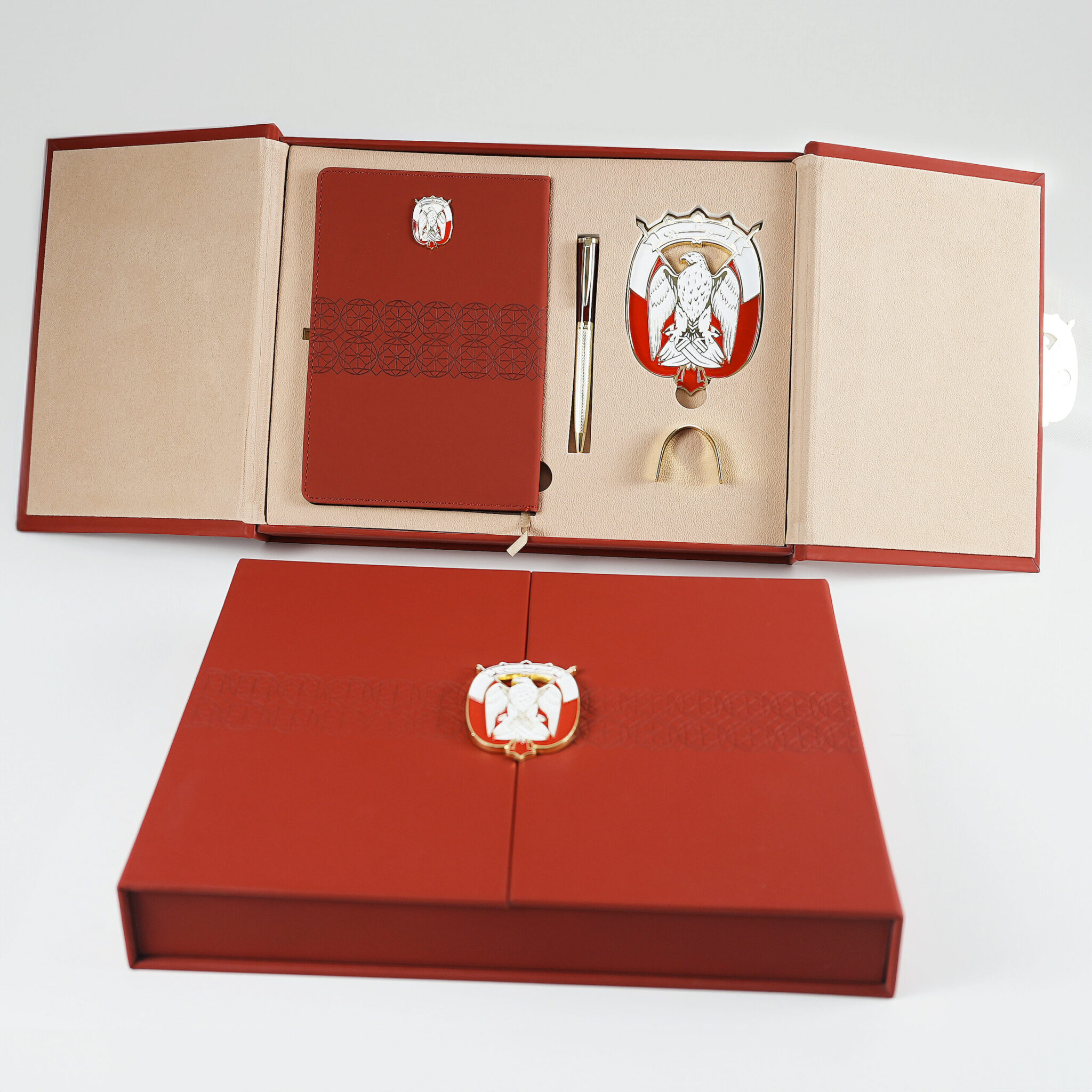 AD Red box with Items includes: Leather Box – Red – AD ABU DHABI metal stand Abu Dhabi pen 2020 leather notebook with calligraphy and AD falcon pin